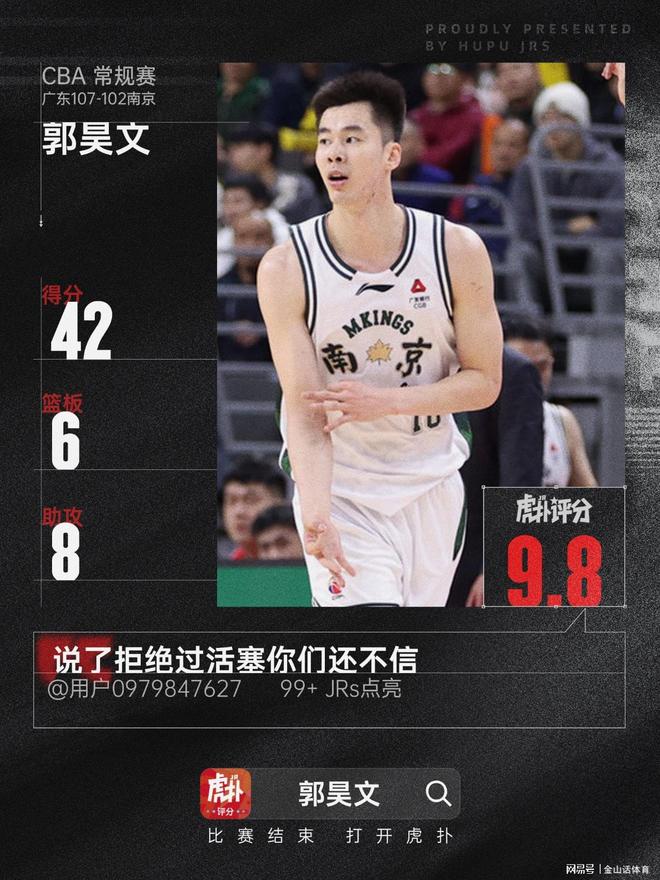 在加时赛里,郭昊文上来就是一记之分,追平个人生涯得分纪录,加时赛末,郭昊文打出续命2+1,但再次遗憾错过关键上篮,最终同曦队惜败广东队。