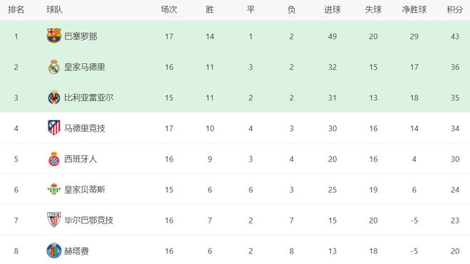 在积分榜上,巴萨14胜1平2负拿到43分,排名榜首。而皇马只拿到36分,排名第2,落后巴萨7分之多。不过,皇马比巴萨少踢1场。比利亚雷亚尔以35分排名第3。第4的是马竞,拿到了34分。西班牙人这匹大黑马的成绩非常出色,拿到了30分,排名第5,只比马竞少4分。这是西班牙人队史单赛季同时期最高积分纪录。皇家贝蒂斯以24分排名第6。